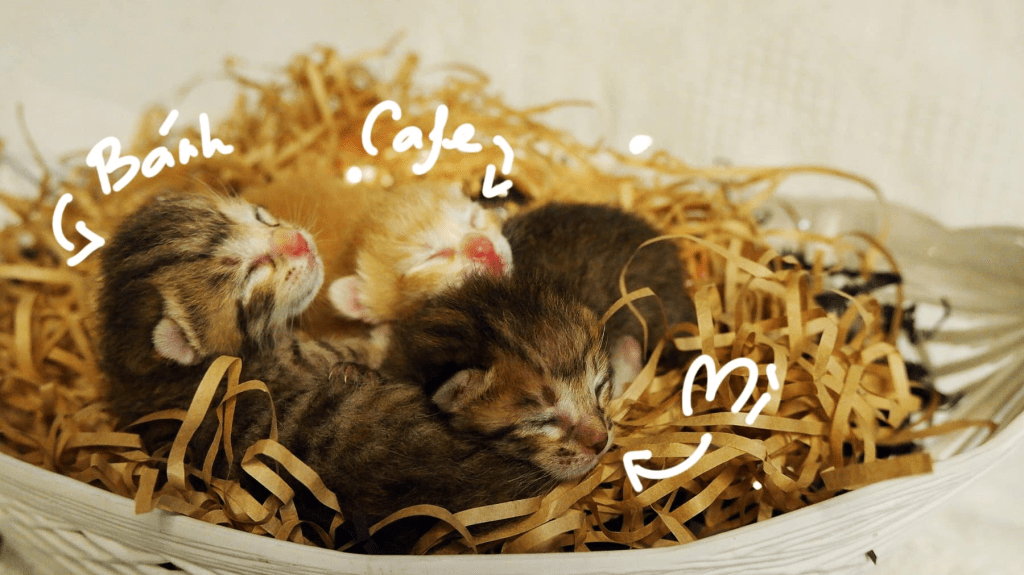 Ba đứa còn lại đều khoẻ mạnh: hai con tabby vằn và một con cam nổi bật. Con cam là đứa to nhất bầy, bú khỏe nhất. Chính vì cái ý chí sống đó mà sau này khi cả bầy nhiễm FIP, chỉ có nó vượt qua được. Mình đặt tên nó là Cafe.