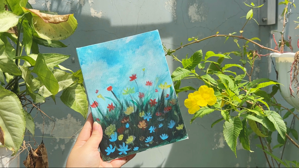Mình bắt đầu pha màu: một chút xanh cho bầu trời, pha thêm ít trắng để thành mây; một mảng xanh đậm, gần như đen, làm nền cỏ. Rồi mình chấm lên vài cụm hoa nhỏ – chẳng theo bố cục nào cả, cứ thế mà điểm xuyến theo cảm hứng.