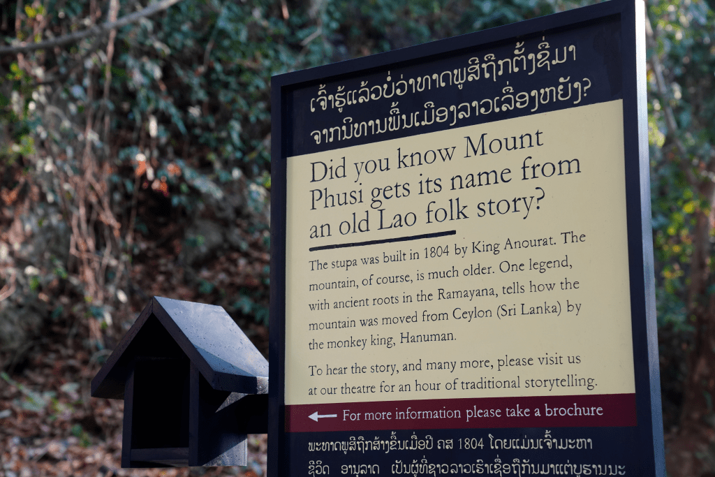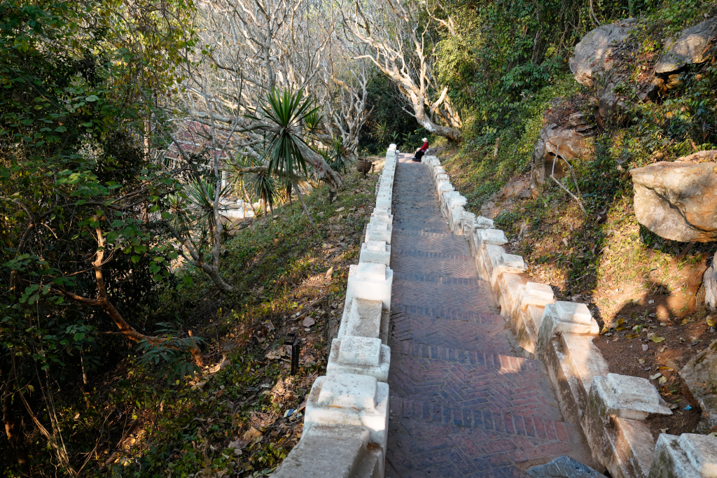 Có hai lối dẫn lên đỉnh Phousi: một con đường nhỏ đối diện Cung điện Hoàng gia, và một lối khác quanh co hơn từ bờ sông Nam Khan. Nhà mình chọn con đường chính – hơn 300 bậc thang xếp đá, gập ghềnh nhưng dễ đi hơn.