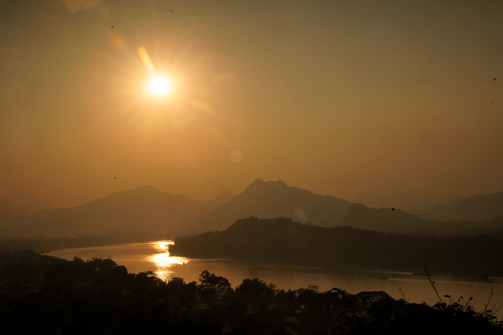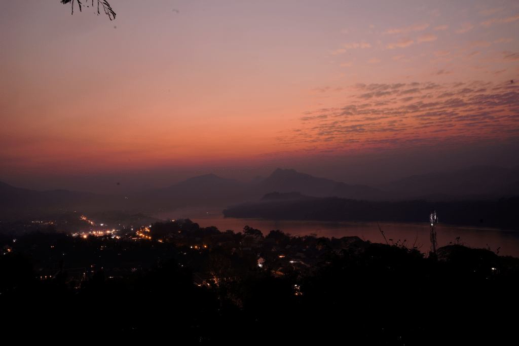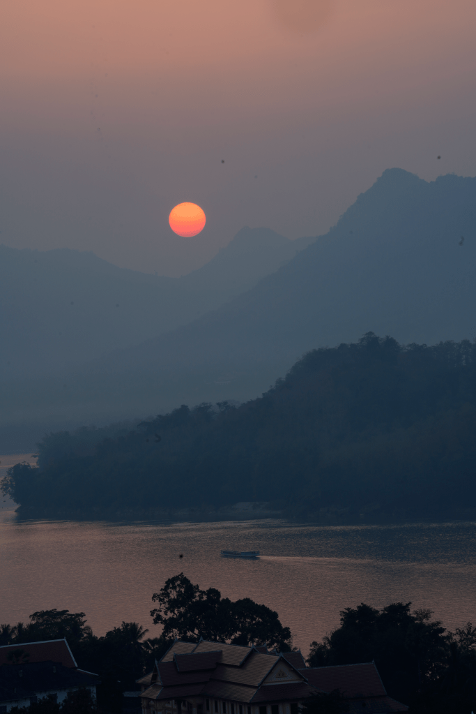 Khoảnh khắc ấy – khi mặt trời bắt đầu trôi dần xuống sau dãy núi phía xa, cả thành phố Luang Prabang như bừng lên trong một biển ánh sáng đỏ rực.
