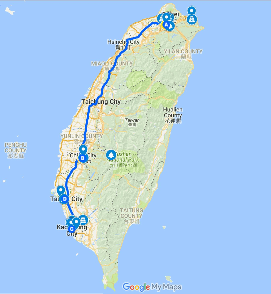 Đó là một chuyến đi đầu tiên mà mình đi từ Bắc xuống Nam, từ Đài Bắc, đến Đài Trung, Đài Nam rồi qua Cao Hùng. Hành trình gần 400km, vừa đi vừa nghỉ, rong ruổi trên những chuyến xe, đổi qua không biết bao nhiêu trạm có đôi khi là xe bus, là MRT (tàu điện ngầm), là TRA (xe lửa) hay là HSR (tàu cao tốc).
