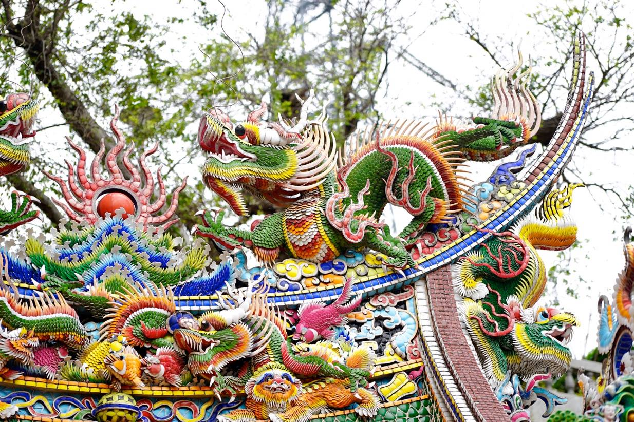 Người ta gọi nghệ thuật trang trí mái chùa này là jiannian – nghĩa đen là “cắt và dán,” nhưng thực tế thì công phu hơn nhiều. Những con rồng rực rỡ, những bông hoa rực màu, cả các tích truyện xưa cũ – tất cả đều được tạo nên từ mảnh sành, mảnh sứ nhỏ tí hon. Nghệ nhân phải làm việc cả trong nắng lẫn gió, từng bước gắn kết các chi tiết lại để dựng thành một tác phẩm chạm khảm ba chiều sống động.