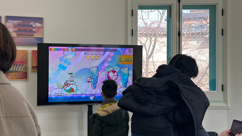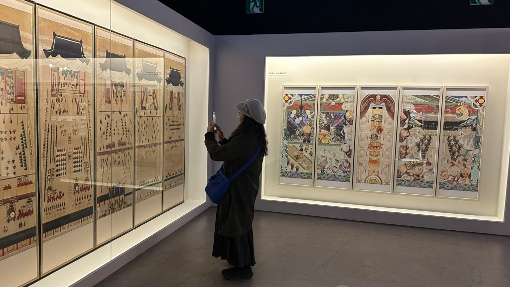 Tại thời điểm chúng tôi ghé tham quan (5/2 – 18/2), bên trong tòa nhà Dondeokjeon đang diễn ra một triển lãm khiến một người vốn chỉ quen nhìn cung điện qua lăng kính lịch sử khô khan như tôi phải dừng lại rất lâu: “CookieRun: In Search of Korea’s Lost Heritage”.
